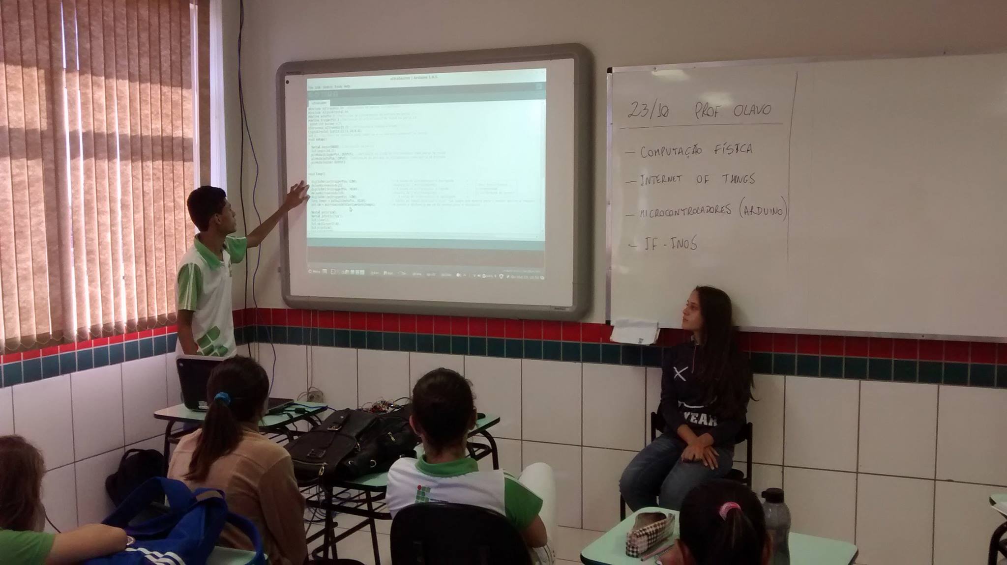 Gilmar Thomas de Araújo Junior e Roberta Aparecida da Silva Alcântara, bolsistas PBIS do projeto IFINOS, auxiliaram uma aula da disciplina de Algoritmos no primeiro ano do Curso Técnico Integrado em Informática (IIN2014) do IFPR de Assis Chateaubriand, explicando o que é a Computação Física, e mostrando exemplos de projetos práticos e códigos utilizados nestes projetos.