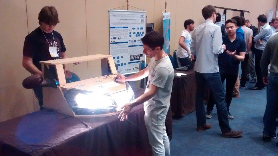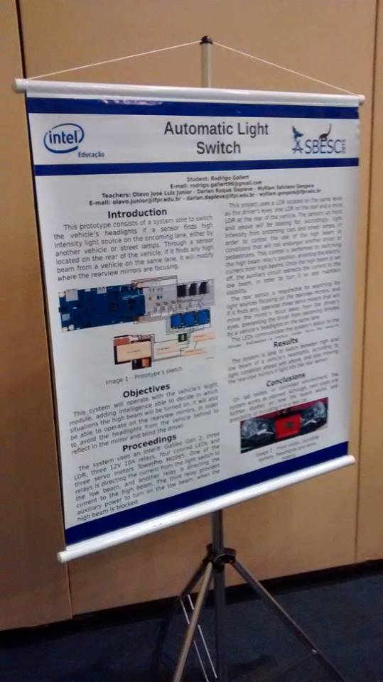 O estudante do curso de Tecnologia em Análise e Desenvolvimento de Sistemas do IFPR Campus Assis Chateaubriand, Rodrigo Gallert, acompanhado dos professores Olavo José Luiz Junior e Darlan Roque Dapieve, participou do V Brazilian Symposium on Computing Systems Engineering da Sociedade Brasileira de Computação em Foz do Iguaçu. O aluno apresentou seu protótipo chamado de ALS (Automatic Light Switch), o qual propõe o controle automático das luzes e retrovisores do veículo a partir da luminosidade que incide do ambiente e dos veículos que trafegam em sentido contrário ou atrás do próprio carro. A primeira fase da competição contou com a submissão de 140 trabalhos de todo o país, dos quais 60 foram escolhidos para receber um microcontrolador Intel Galileo Gen2 para desenvolver o projeto. A partir do relatório do desenvolvimento, os 33 melhores trabalhos foram selecionados para apresentação durente o SBESC, sendo 32 trabalhos de diversas universidades do país, e o ALS, único representando os Institutos Federais. O coordenador da competição comentou com o grupo sobre a relevância das pesquisas com Carros Inteligentes, que tem sido fomentada pela Intel, e convidou o estudante a enviar um novo trabalho para a competição de 2016, que terá a fase final realizada em João Pessoa na Paraíba, durante o VI SBESC.