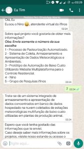 Entre os dias 17 e 20 de maio ocorre no Centro de Convenções e Eventos de Cascavel a 1ª TechNovação. Estruturado em ecossistemas de inovação com mostras nas áreas de tecnologia, automação, robótica, ambiental, rural, economia criativa e empreendedorismo, a feira agrega diversas ICT (Instituições de Ciência e Tecnologia), empresas privadas, iniciativas públicas, IES (Instituições de Ensino Superior) e escolas do ensino fundamental e médio com vistas a promover atrações a esses públicos. O IFPR está presente com uma mostra de protótipos, expondo seus trabalhos como participantes da 10ª edição da InnovaCities, Feira Internacional de Ciências Aplicadas, Invenções, Inovações e Negócios, que este ano soma 54 projetos inscritos. Os espaço IFPR apresenta 11 protótipos, de 6 Campi e da Agência de Inovação da Proeppi, sendo 3 projetos do Campus Assis Chateaubriand, desenvolvidos e apresentados pelos participantes do Grupo de Pesquisas ifinos. Além dos projetos inscritos, o Campus Assis Chateaubriand apresentou o Ninos, assistente virtual desenvolvido no curso de TADS, que interage com os participantes por meio do whatsapp. Quem quiser conversar com o Ninos, basta cadastrar o whatsapp (44)9 9177-1410, e lhe escrever uma mensagem de saudação, que ele inicia a conversa, e se encontra disponível para acesso.