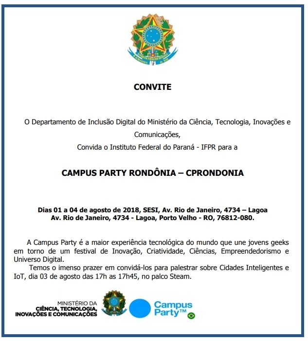 A Campus Party, maior experiência tecnológica do mundo que reúne jovens geeks em torno de um festival de Inovação, Criatividade, Ciências, Empreendedorismo e Universo Digital, chega ao norte do país com a realização da Campus Party Porto Velho, capital de Rondônia.