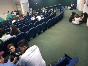 Na parte da tarde, os estudantes do curso de informática que compõe a equipe do Células Empreendedoras (Ana Flora Spada Bim, Bruno Gustavo Leonardo, João Mario Bulla Oliveira, Larissa Gabriella Albuquerque Baldoino, Mariana Boiago Flamia e Vitória Gabrielly Vieira dos Santos) conduziram uma Oficina de Design Thinking para os estudantes de todos os cursos integrados do IFPR, com o objetivo de encontrar soluções para problemas do nosso dia a dia, e selecionando projetos a serem desenvolvidos no CitAC.