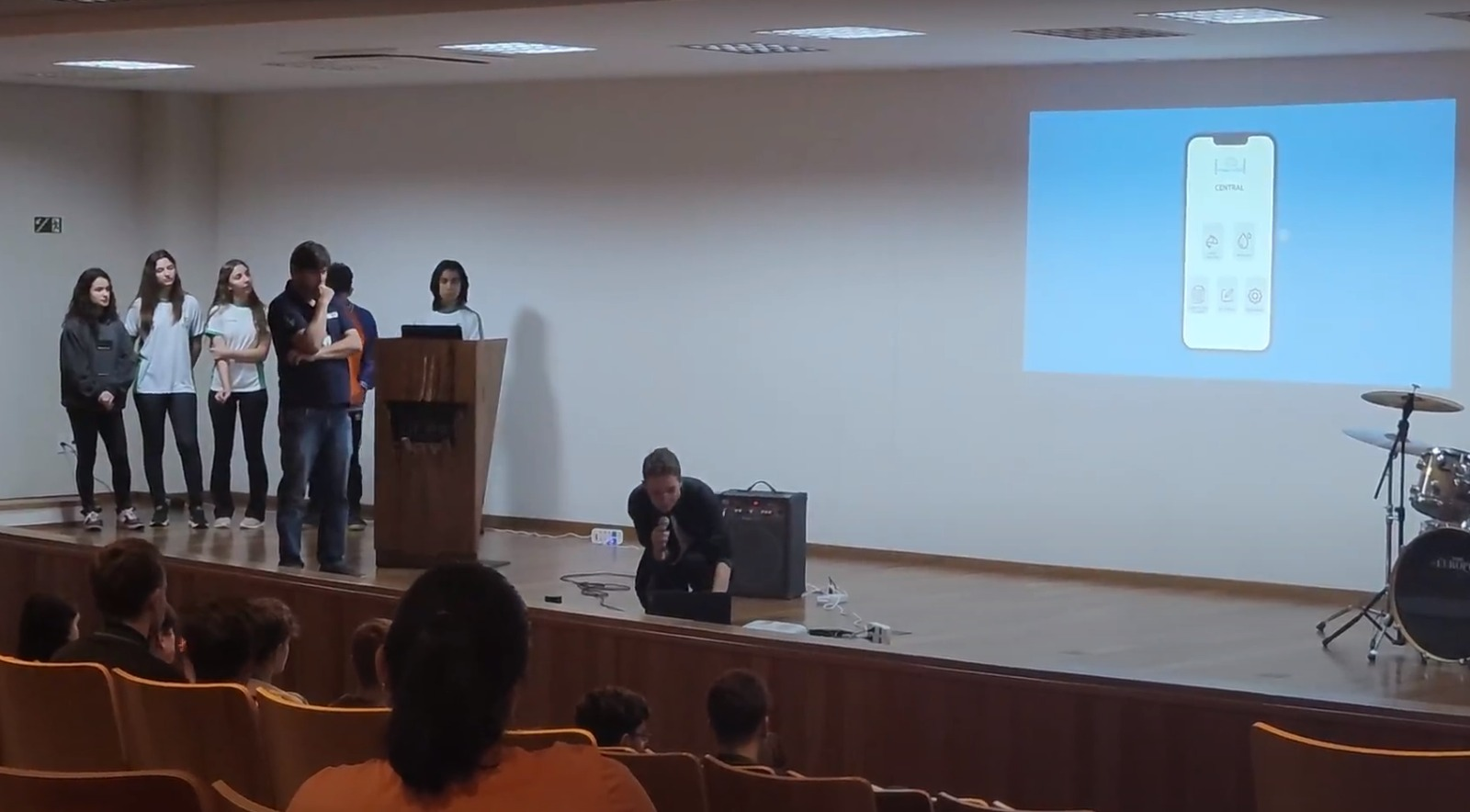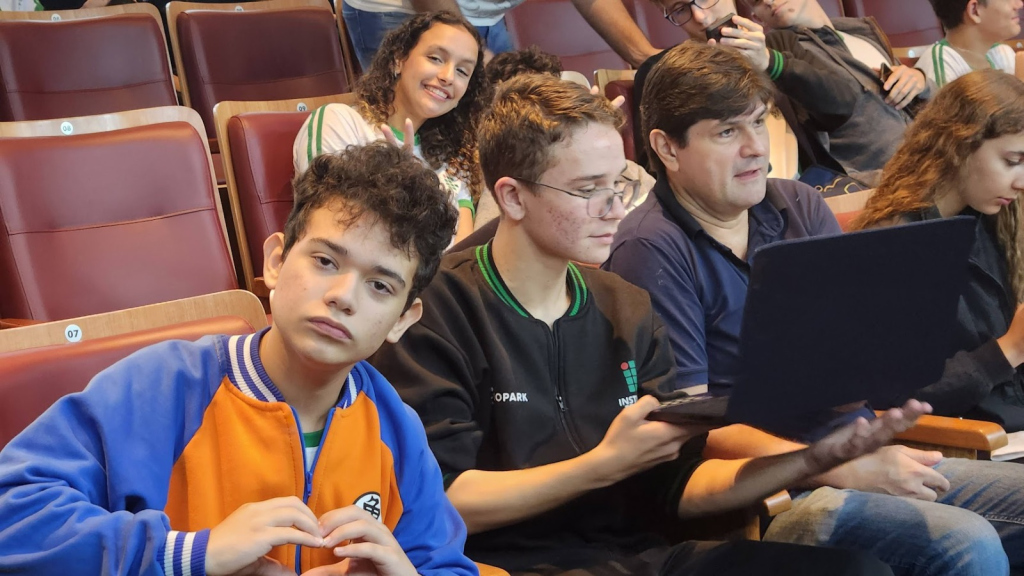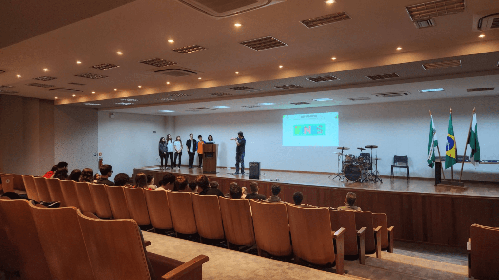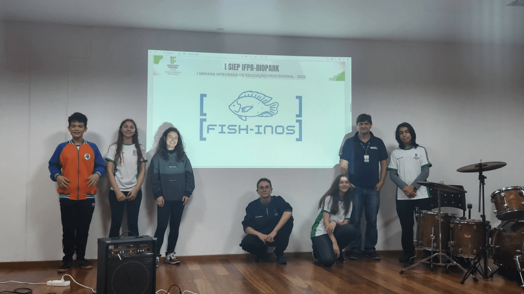 Logo após, os estudantes que participam do projeto de desenvolvimento de tecnologias para piscicultura, o [FISH-INOS], Clara, Giovanna, João Paulo, Jomar, Lucas e Nathaly, falaram sobre o projeto e apresentaram suas produções que estão sendo realizadas sob coordenação dos professores Olavo e Rafael Bartz.