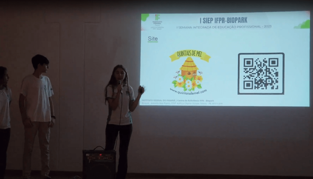 Estudantes do projeto Quintais de Mel, Clara, Giovanna, Luiz Henrique, Nathaly e Tainá, falaram sobre os objetivos do projetoe apresentaram as diversas atividades de educação ambiental que tem sido realizadas internamente e com a comunidade, com o apoio do professor Eduardo Felippsen.