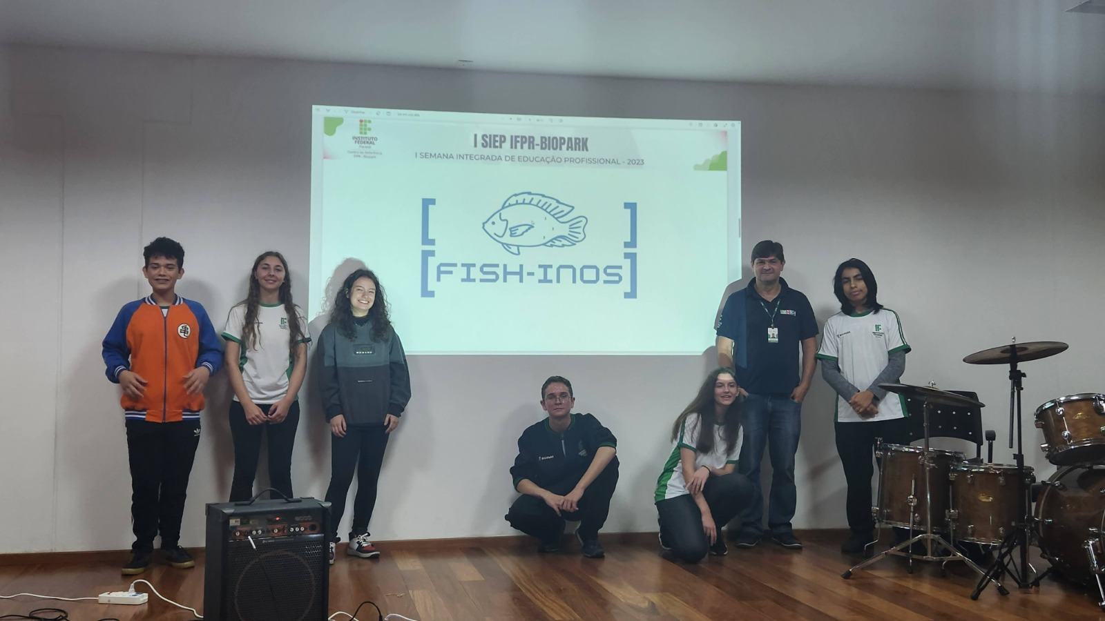 E o grupo aproveitou a oportunidade para revelar o logotipo que foi escolhido para o [FISH-INOS]. Esse logo foi resultado do trabalho compartilhado de muitos estudantes, alguns até que não fazem parte do projeto. Um importante passo no sentido de garantir uma identidade visual para o grupo.